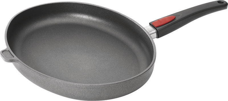 Cuisez uniformé.ment grâ.ce au fond thermique de 8 mm d'é.paisseur qui ré.partit la chaleur de maniè.re homogè.ne sur toute la surface de la poê.le Titanium de WOLL. Sa forme ovale s'adapte parfaitement aux poissons.