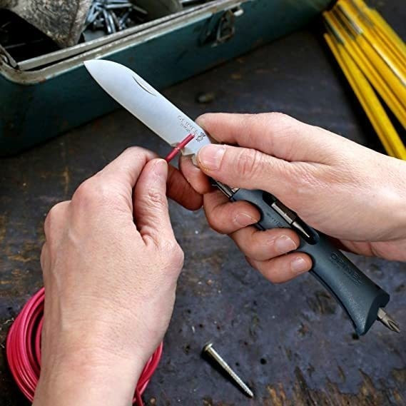 En y ajoutant des fonctions spé.cifiques comme le coupe fil ou le dé.nude fil pour les travaux d'é.lectricité., mais aussi les 2 embouts tournevis (cruciforme ou/et plat) qu'il est possible de fixer en bout du manche en polyamide, Opinel a su cré.er le couteau indispensable au bricolage.