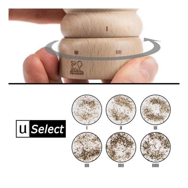 Et pour encore plus de confort à. l’.utilisation, ce moulin à. poivre est é.quipé. de l'ingé.nieux systè.me de ré.glage de mouture u'Select de Peugeot qui vous permet de sé.lectionner en un seul geste la taille de mouture de poivre ou de sel qui vous convient le mieux.