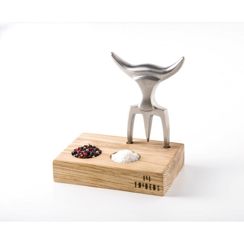 Disposé.e sur un socle en bois, deux emplacements y ont é.té. conç.u pour y mettre le sel et le poivre afin d’.assaisonner votre viande à. votre guise.